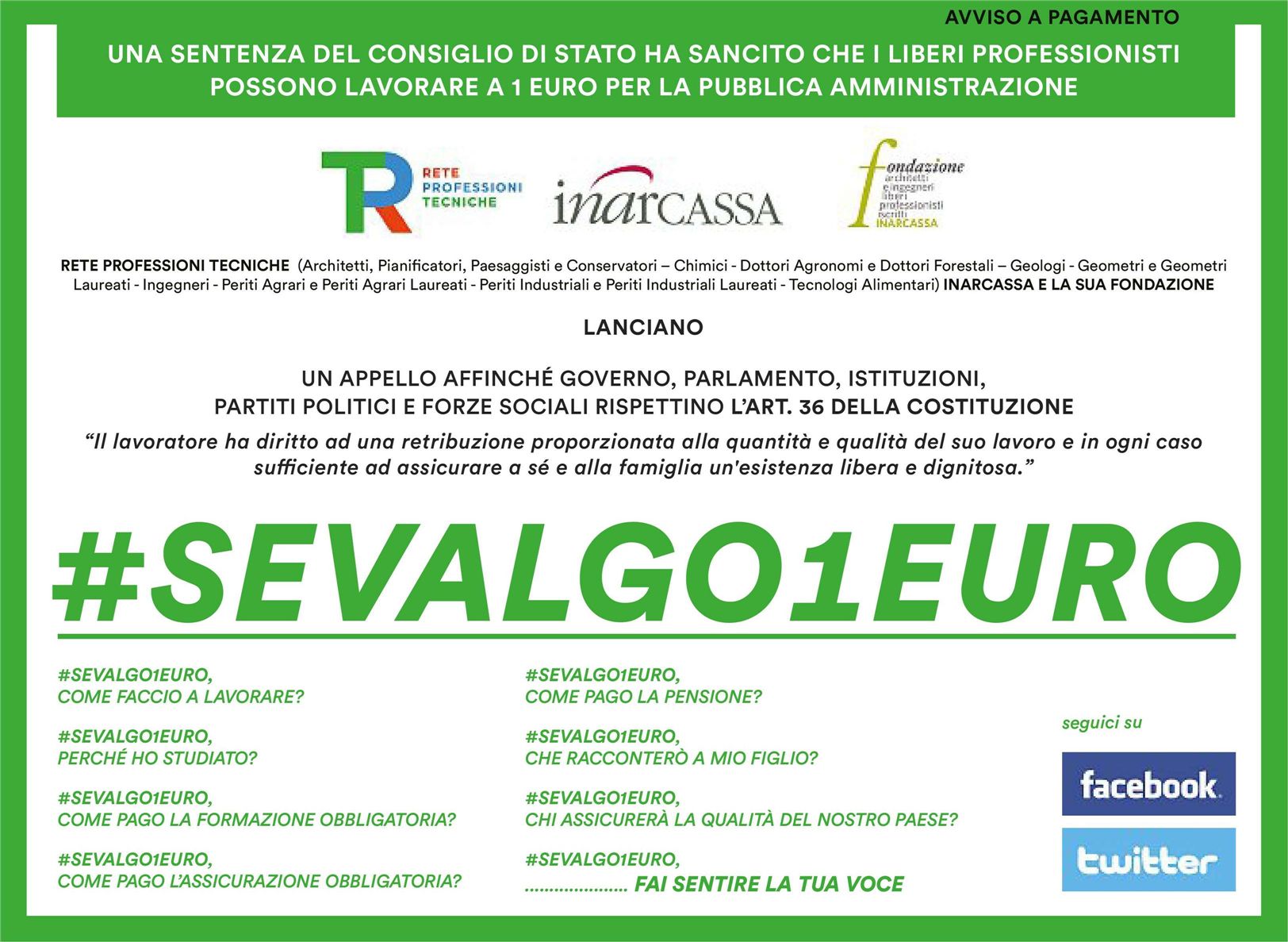 Con #SEVALGO1EURO, Inarcassa invita gli architetti e gli ingegneri a perorare, nei modi e nelle sedi opportune, il rispetto da parte delle istituzioni dei principi sanciti dall’art. 36 della Costituzione: il diritto – negato dalla sentenza – ad una retribuzione proporzionata alla qualità e alla quantità del lavoro prestato.