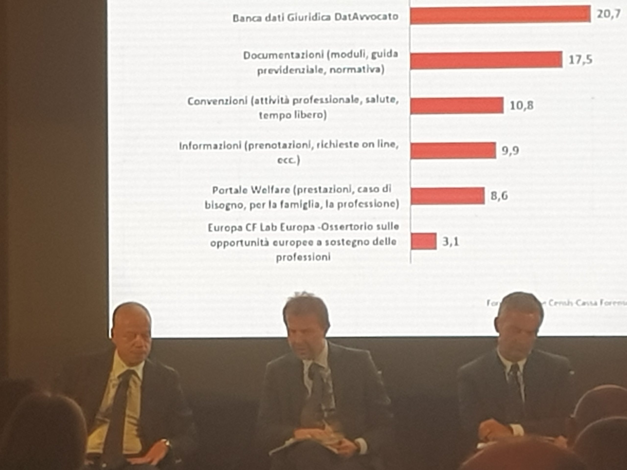 Il dato sul grado di utilizzo dei servizi on line della Cassa Forense evidenzia che il 20,7% degli intervistati si collega almeno una volta al mese alla banca dati giuridica DatAvvocato. Il 17,% si collega almeno una volta al mese per la consultazione di moduli, guida previdenziale, normativa). Il 10,8% degli intervistati si collega almeno una volta al mese per consultare le convenzioni, il 9,9% per il servizio di informazioni, l’8,6% consulta il Portale Welfare ed il 3,1% per consultare il recente Portale Europa Cf Lab Europa, l’Osservatorio sulle opportunità europee a sostegno delle professioni.